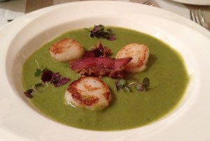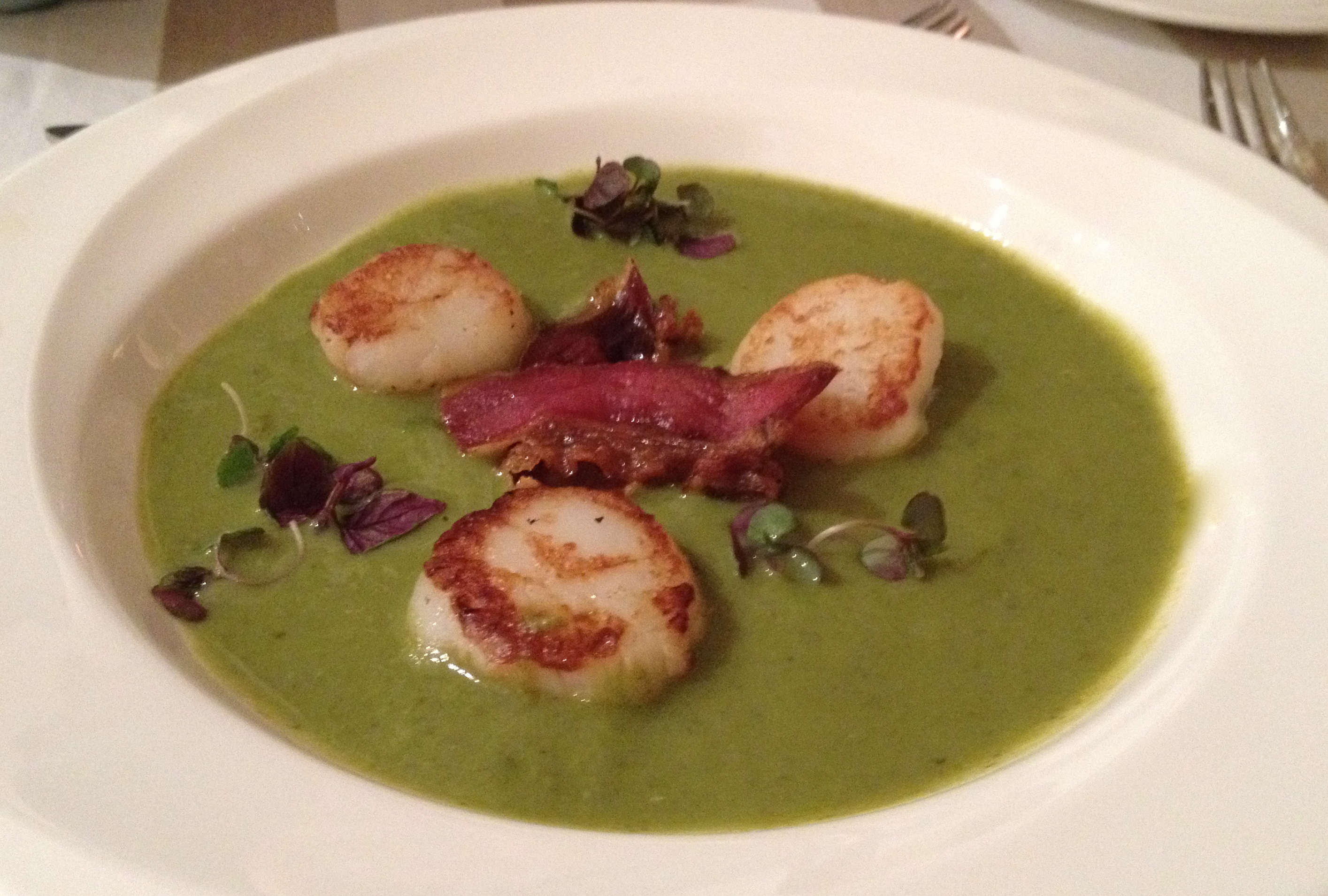Ladle soup into a wide soup bowl. Place the scallops in the bowl and garnish with a slice of pancetta.