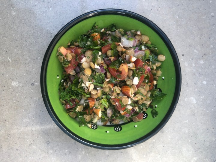 This salad can be eaten on its own, topped with a tablespoon of homous or slices of avocado or served with some grilled meat or chicken.